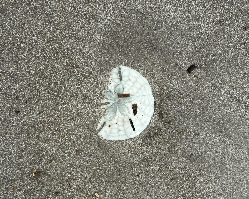 The tide was low, the air was still, and I saw it…a white sand dollar in the sand. A sign of completion, of letting go.